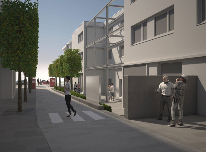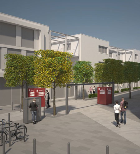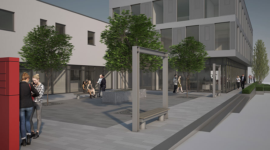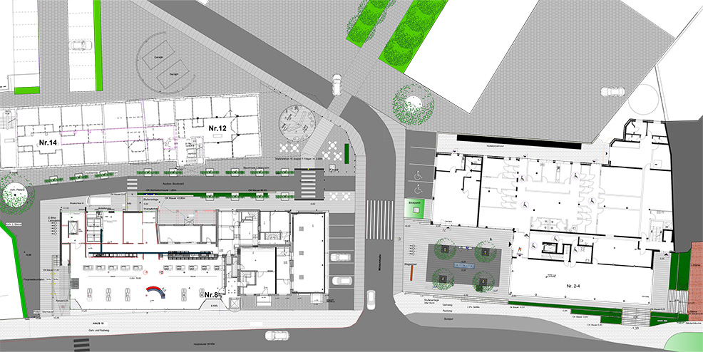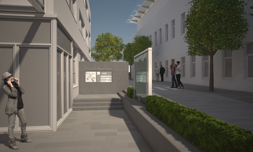 Der Gesamtkomplex erhält, mit der Etablierung des verbindenden Boulevards, ein individuelles Gesicht mit hohem Wiedererkennungswert, leichter Orientierung und positiven Aufenthaltsqualitäten. Die Mühlenapotheke, als Herzstück im Quartier, erhält boulevardseitig eine barrierefreie neue Haupteingangssituation mit eindeutiger Adressbildung. Ein durchgängiges Beleuchtungskonzept garantiert Sicherheit und unterstützt bei der Orientierung.