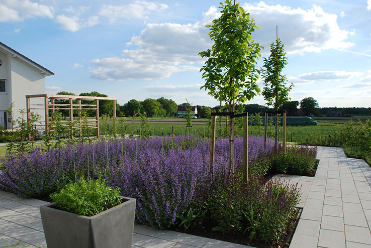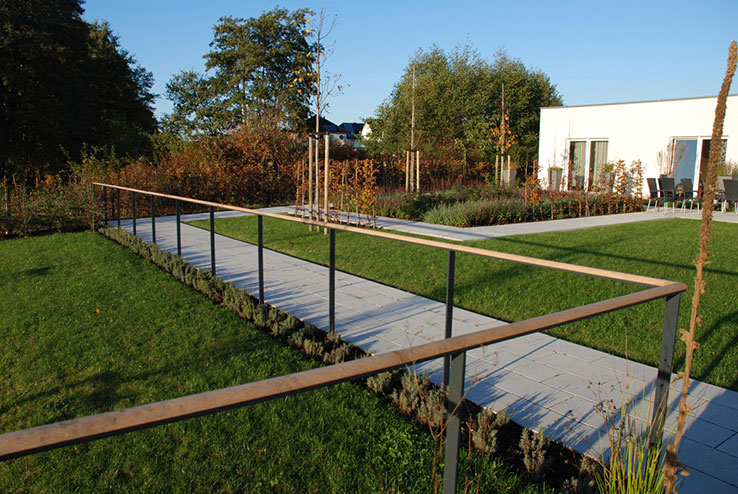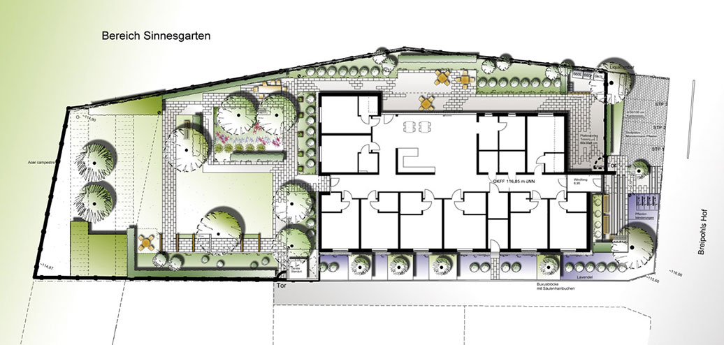 Die SeniorenHausgemeinschaft ‘Breipohl‘s Hof‘ orientiert sich an den Bedürfnissen von demenzkranken Menschen, die eine alternative Wohnform zur stationären Pflege suchen. Ein kleiner Gartenrundweg führt vorbei an duftenden Kräutervasen und dauerblühenden Staudenbeeten. Mehrere Sitznischen, im Garten verteilt, dienen als kleine Aufenthalts-bereiche, Rückzugsgebiete und Quasselecken. Die Barrierefreiheit ist in allen nutzbaren Gartenteilen durch Bodenauffüllungen gewährleistet. Zur freien Landschaft erhält der Garten klare Böschungsmodellierungen. Ein filigranes Geländer trennt diesen Bereich zum Schutz der Bewohner ab und dient gleichzeitig als Gehilfe zum selbstbestimmten Spazierengehen.