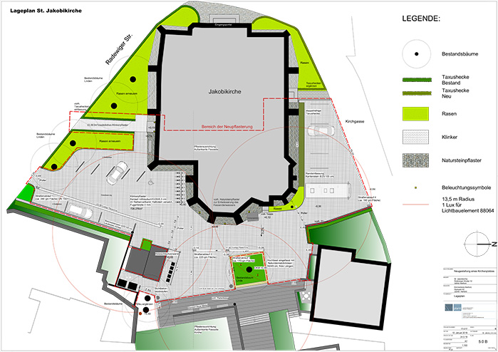 Es wird eine innerstädtische Platzsituation geschaffen, die als großer zusammenhängender Kirchplatz wahrgenommen wird. Natursteinkleinpflaster wird um den Kirchensockel an die neue Höhensituation angepasst. Die Jakobikirche wird abends mit Lichtakzenten inszeniert; zudem sorgen zurückhaltende Lichtbauelemente für Orientierung und Sicherheit.