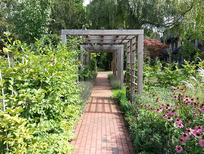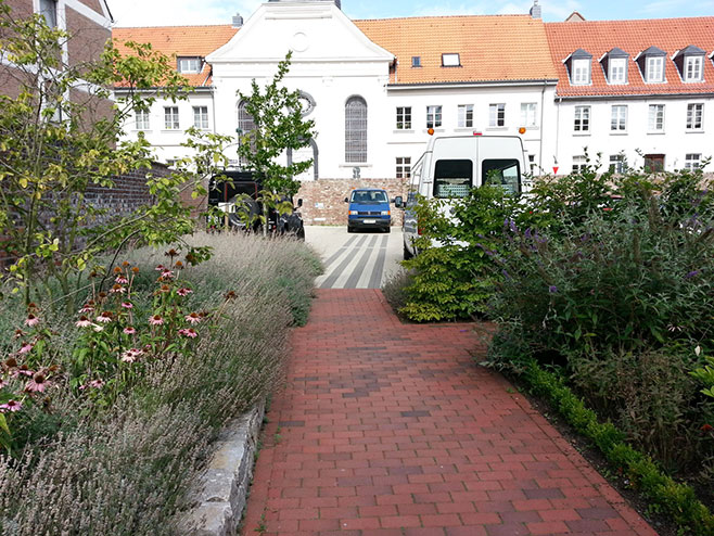 Vom Hauptweg laden seitliche Blickachsen zu einer stimmungsvollen Reise durch den Garten ein, der sich wie selbstverständlich in die schöne Umgebungsarchitektur mit Kirche und Backsteinmauer einfügt. Diese Kulisse schafft eine ganz eigene geborgene Stimmung und schafft Anreize für die Bewohner, sich mit der neuen Parklandschaft zu identifizieren.