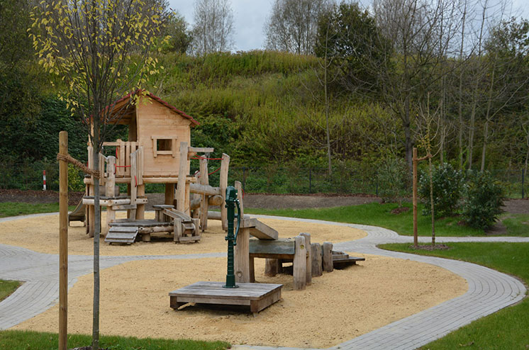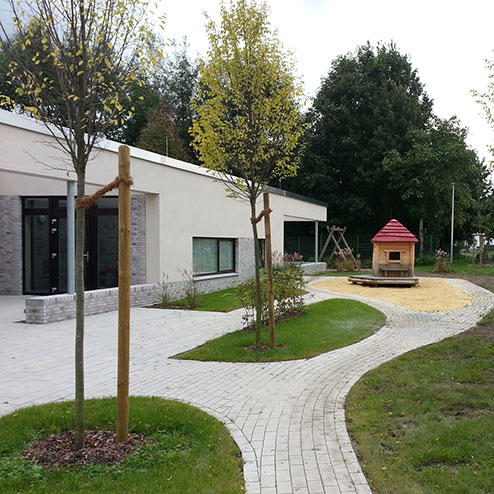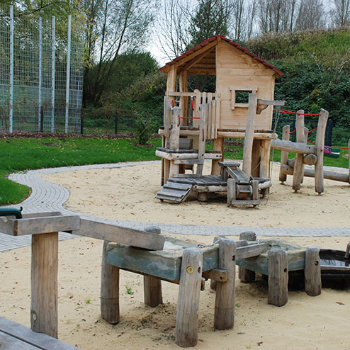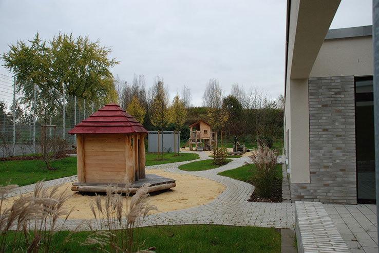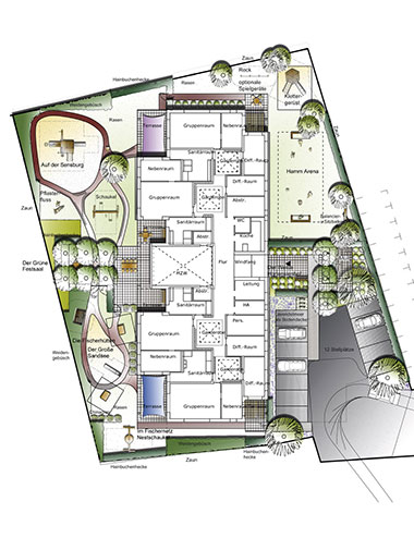 Zentrales Element dieser Kita-Außengestaltung ist der Grüne Festsaal, der sich aus der Mittelachse des Gebäudes schiebt. Um ihn herum und durch ihn hindurch lädt ein mäandrierender Pflasterfluss zum Toben mit Bobby Cars ein. Er umspült drei Sandbänke, die mit attraktiven Spielstationen aufwarten: dem großen Wassererlebnisbrunnen, der gemütlichen Fischerhütte und der Sensburg, einer anspruchsvollen Kletteranlage. Auf der anderen Gebäudeseite wartet der Garten mit einer großen Bolzwiese für kleine Turniere auf.