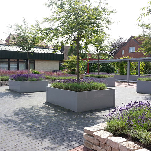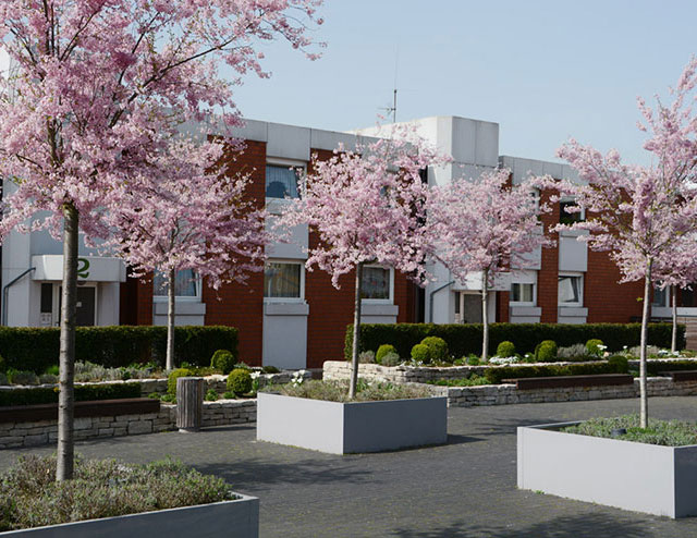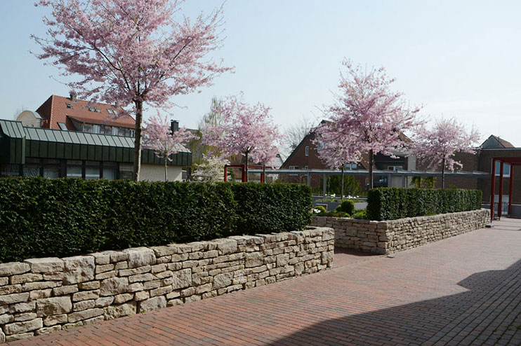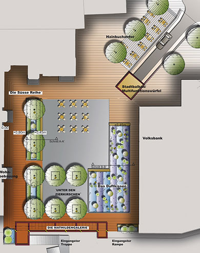 Die Gestaltungsidee des Königin–Mathilde-Platzes fußt auf dem Sichtbarmachen der historischen Stadtbezüge und der kulturellen Bräuche. In Anlehnung an das, jährlich auf dem Platz, stattfindende Kirschblütenfest schenken Blütenwolken aus Zierkirschen dem kulturellen Ereignis eine greifbare Verbindung. Das Kirschentor und eine ’Süße Reihe’ bilden die neue westliche und südöstliche Platzkante. Ungewollte Sichtbezüge blenden diese Blütenbäume gekonnt aus.