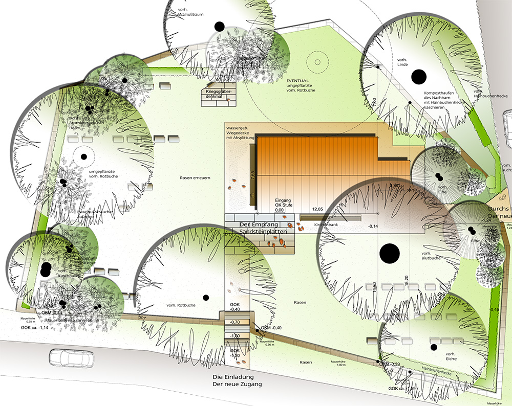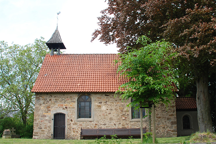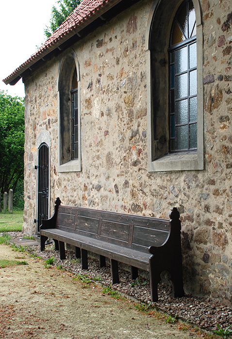 Grundgedanke der Freiraumplanung ist bei dieser Kapelle die gestalterische Einbindung in die umliegende Gemeinde. Dafür wird die umfriedende Bruchsteinmauer an der einladendsten Seite geöffnet, um eine eindeutigen Zugangsmöglichkeit herauszuarbeiten. Sandsteinstufen und -platten lenken den Weg zum Eingang. Auf der gegenüberliegenden Wegseite wird mit Hilfe einer zweiten Eibe eine lauschige torartige Nebeneingangssituation geschaffen. Zusammen mit den luftigen Fliedersträuchern und den Hainbuchenhecken blendet sie störende Blickbeziehungen zur Umgebung aus. So erhält die kleine Kapelle einen Rahmen, in dem ihr reizvolles Ambiente zur würdigen Geltung kommt, und rückt bei schönen und besonderen Anlässen wie Taufen und Hochzeiten wieder in den Mittelpunkt des Gemeindelebens.
