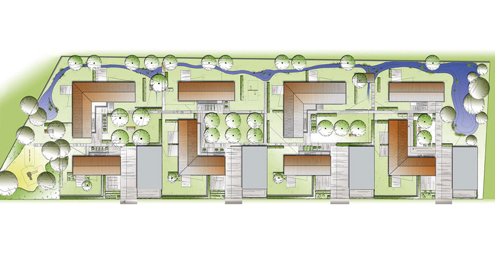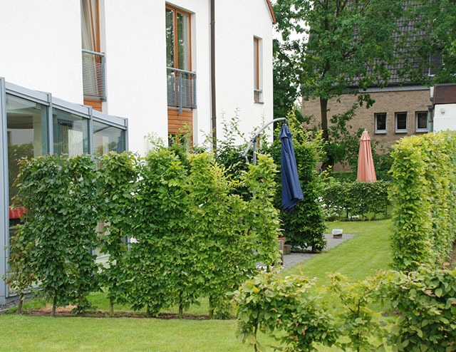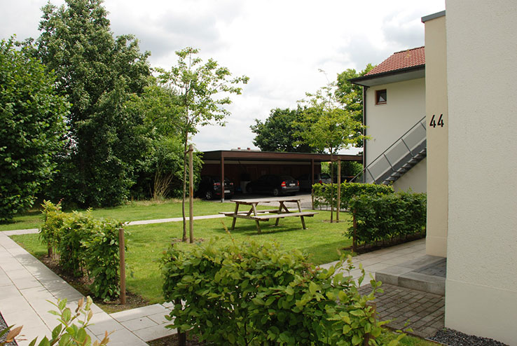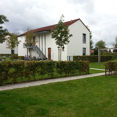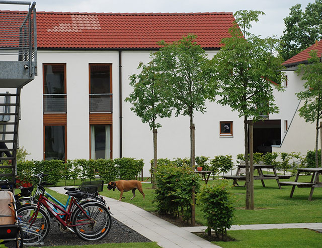 Technische Planungsvorgabe ist die vollständige Regenwasserversickerung auf dem eigenen Grundstück gewesen. Überdies sollen neue Wohnqualitäten durch nutzbare Gartenräume und verbesserte Wegebeziehungen geschaffen werden. Es entstehen vier Gartenhöfe mit eigenen Pflanzenmotiven. Unterschiedliche Blütenfarben und Herbstfärbungen verleihen diesen Höfen eigenständige Charaktere. Die Kommunikation der Mieter untereinander wird gefördert; Kinder haben zudem mehr Spielmöglichkeiten. Zur freien Landschaft bilden kleine Stationen Treffpunkte.